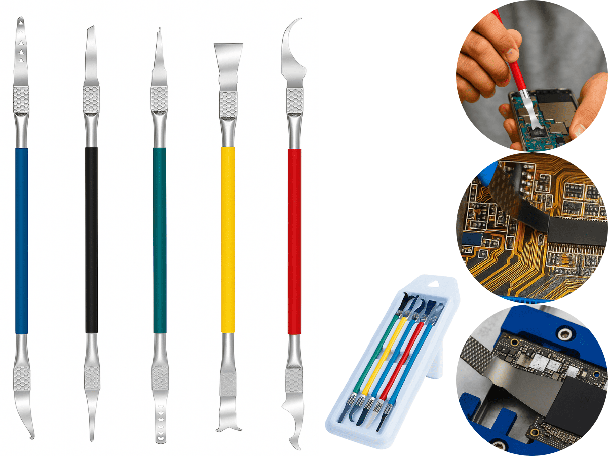 - Kit completo de espátulas metálicas profissionais projetadas para remoção de chips, desmontagem precisa de placas eletrônicas, raspagem de cola, separação de componentes e assistência técnica em celulares. Ferramentas resistentes, de alta precisão e acabamento premium, ideais para técnicos que buscam segurança, firmeza e eficiência no reparo de dispositivos.